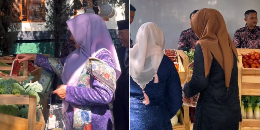 Dalam ini video yang beredar, tampak emak-emak tersenyum lebar sembari membawa kantong berisi terong, kangkung, bayam, tomat, dan cabai.